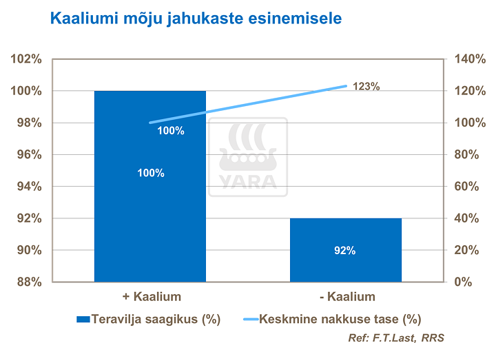 Kaaliumipuuduses taimedes on häiritud erinevad sünteesiprotsessid, näiteks tärklise, proteiini ja tselluloosi süntees. Seetõttu tõuseb väiksemate ühendite, näiteks amiidide tase taimes, viimased on sobivaks toiduallikaks taimehaigustele. Kaaliumipuudusest põhjustatud õhemad rakuseinad on väiksema mehaanilise vastupidavusega. Enam kui 1000 katses teraviljadega selgitati välja, et aladel, kus kaaliumi kättesaadavus on väike ning ei ole lämmastikuga tasakaalus, suurendas kaaliumiga väetamine odrataimede vastupanuvõimet haigustele enam kui 70% juhtudest (PDA). Kaaliumipuudust seostatakse ka suurema nakatumisega jahukastesse ning roostetesse.